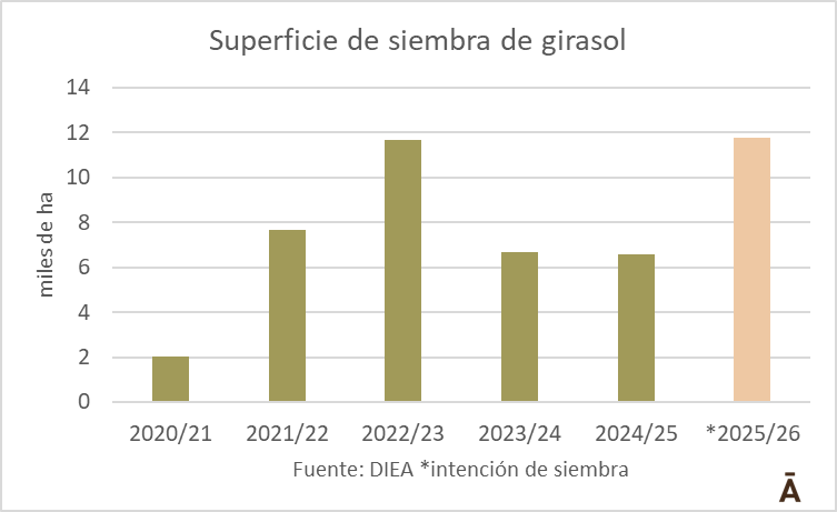 De acuerdo a la última encuesta de la DIEA, el área de siembra de girasol sería de unas 11.751 ha en esta campaña, un máximo histórico, superando la marca anterior del ejercicio 2022/23 de 11.700 ha.