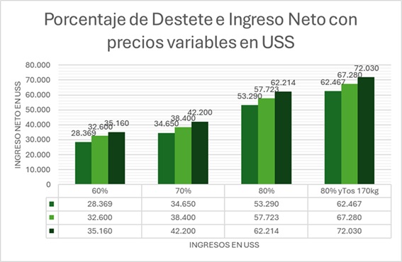 Para cada nivel de destete (60%, 70%, 80% y 80% con terneros de 170 kg), se evaluaron los ingresos bajo tres escenarios de precios: