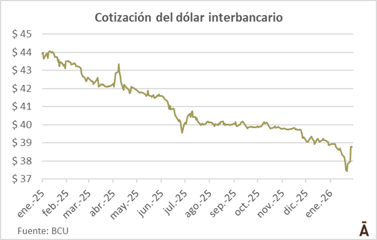 El dólar interbancario se anotó otra fuerte suba en el mercado cambiario uruguayo este miércoles. La última operación en el mercado mayorista se pactó a $ 38,90, esto fue un 1,6% por encima del cierre del martes.