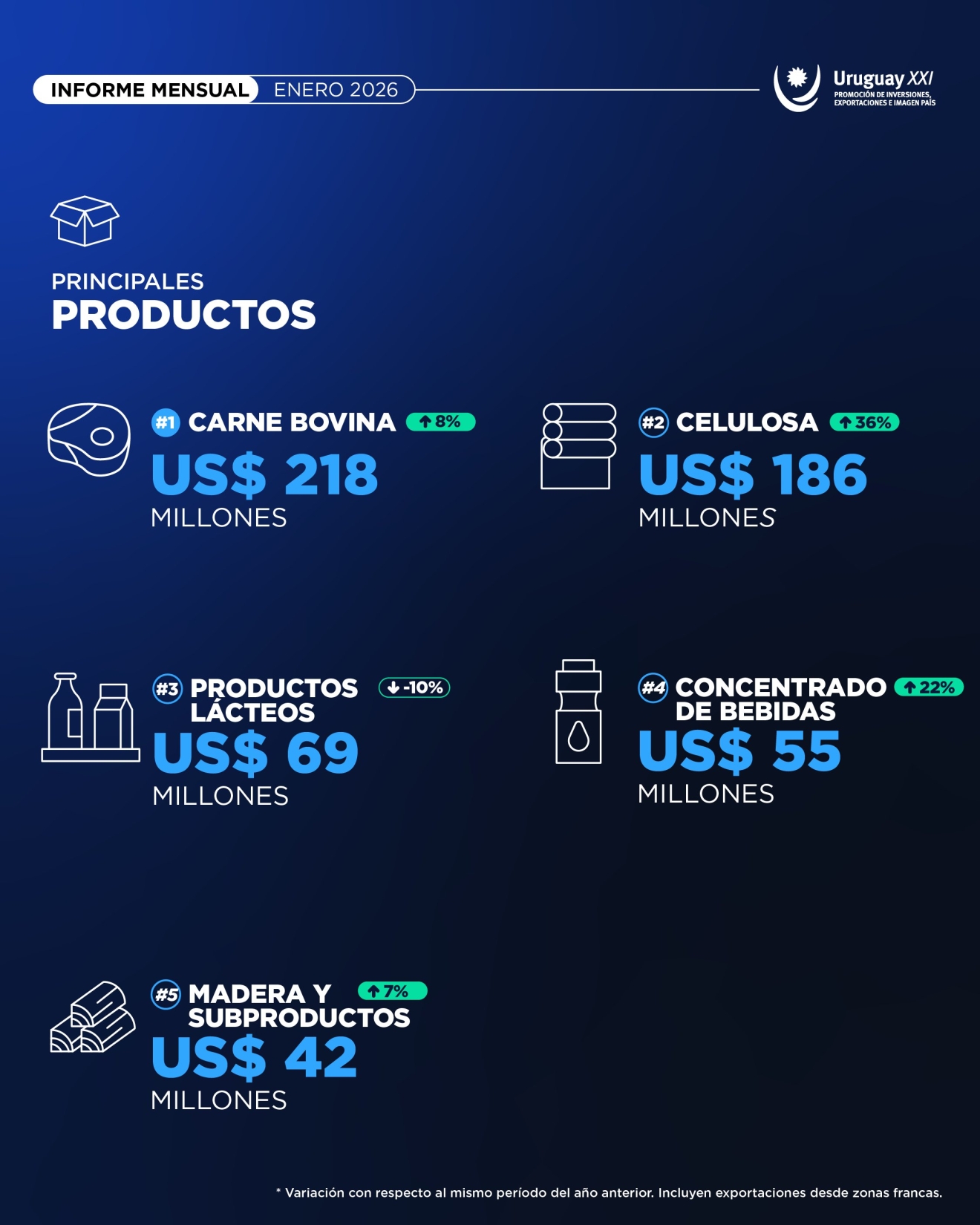 Las solicitudes de exportación alcanzaron US$ 995 millones en enero de 2026 y marcaron un incremento interanual de 9%. La carne bovina fue el principal producto del mes, con ventas por US$ 218 millones (+8% interanual). En segundo lugar se ubicó la celulosa, con US$ 186 millones, y los productos lácteos ocuparon el tercer lugar, con US$ 69 millones, informó Uruguay XXI.