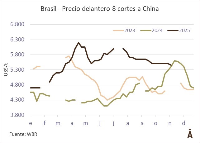 Las entradas están cortas, en el eje de 5-8 días, lo que da la pauta de que, a pesar de la ventana de cuota, la industria está necesitada. Da la sensación de que, con las condiciones climáticas jugando un papel más que preponderante, la industria no logrará llevar los precios al objetivo que pretendía y que la corrección a la baja empezó a quedar atrás.