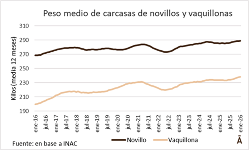 El destaque, en lo que a carcasas más pesadas refiere, se lo llevan las vaquillonas. En 2015 el peso medio de las vaquillonas arañaba los 200 kilos. Diez años después promedió 238 kilos.
