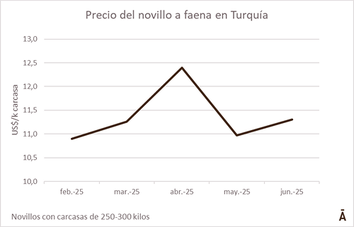Los precios de la hacienda en Turquía subieron fuerte en la última semana, lo que con seguridad está relacionado con la suspensión de ventas por los casos de aftosa en varias provincias. La semana pasada se produjeron subas de 4.000 liras turcas para las vacas (unos US$ 100 por cabeza) y 2.500 liras turcas en el caso de los terneros (US$ 64). Estos últimos cotizan al equivalente a unos US$ 1.850, en tanto que novillos para engorde se pagan a US$ 2.600.