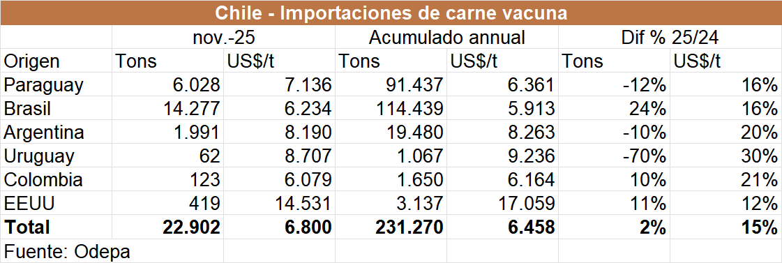 En el acumulado del año a noviembre Chile importó 231.270 toneladas de carne vacuna a un valor medio 6.458, con un moderado aumento de 2% en el volumen y de 15% en el caso del valor medio. En este período las importaciones desde Brasil crecieron 24% anual, convirtiéndose en el principal proveedor, en tanto que las de Paraguay bajaron 12%.