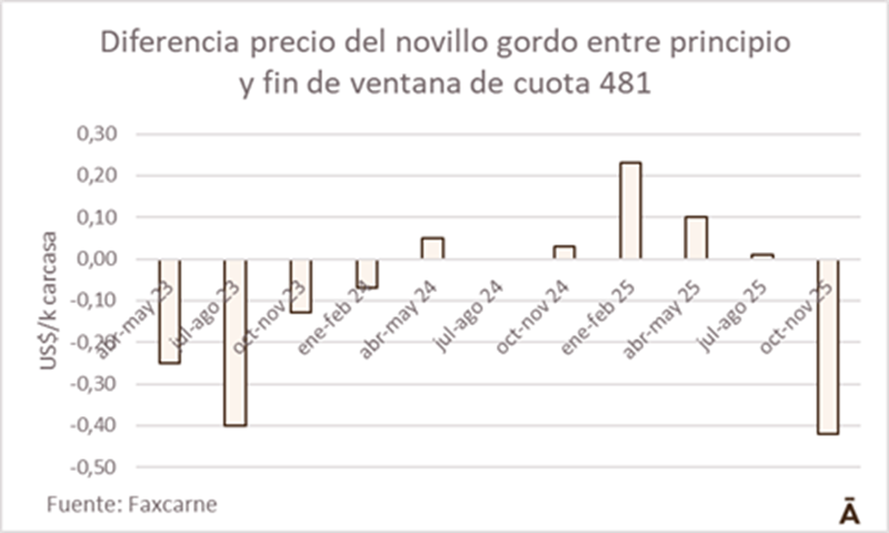 En las anteriores ventanas de este año, mientras los valores de la carne en el mercado internacional venían en una sólida trayectoria alcista, sumado a la escasez de oferta interna de animales terminados, los precios entre el inicio y la finalización de la ventana de cuota no sufrieron bajas. Por el contrario, mantuvieron la tendencia de valorización. Entre el principio y el final de la cuota de enero/febrero de 2025 el precio del novillo especial de pradera se valorizó más de US$ 20 centavos.