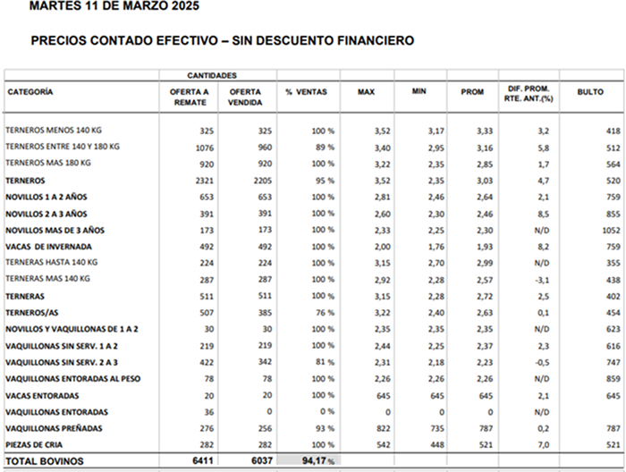 El intermediario manejó valores promedio de US$ 4,50 por kg carcasa para los mejores novillos, con un piso de US$ 4,40 y un techo de US$ 4,60 para negocios puntuales. Para la vaca gorda, reportó una cotización promedio de US$ 4,15-4,20, y de US$ 4,30 para las vaquillonas. Las entradas siguen cortas, entre cinco días y una semana como máximo.