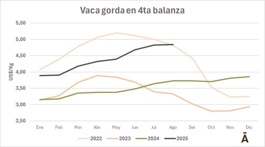 De acuerdo con los datos semanales del Instituto Nacional de Carnes, la vaca gorda en cuarta balanza se ha mantenido hasta la primera quincena de agosto, con valores muy superiores a los de 2023 y 2024, sin embargo, las referencias hasta julio se posicionaron por debajo de 2022, igualándose recién en los últimos 15 días.