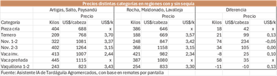 Analizando los datos del Asistente IA de Tardáguila Agromercados —al que los interesados pueden acceder de forma gratuita en este link— se observan diferencias apreciables entre los departamentos del norte (Artigas, Salto y Paysandú) y los del sureste (Rocha, Maldonado y Lavalleja), la región más afectada por la sequía desde principios del verano.
