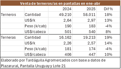 En el año a fin de abril se comercializaron 58.011 terneros y 19.213 terneras en los tres principales consorcios de ventas por pantalla (Plazarural, Pantalla Uruguay y Lote 21), con un sólido aumento respectivo de 18% y 19% respecto a los mismos cuatro meses del año anterior.
