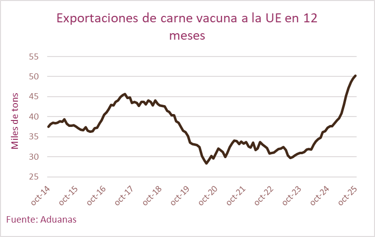 Las grandes necesidades de importación de la UE han hecho crecer fuertemente los volúmenes exportados por Uruguay a este destino. En los 12 meses a octubre las colocaciones de carne fresca superaron las 50 mil toneladas, algo que no se daba desde 2010, 15 años atrás.