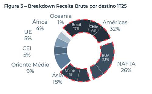 Los ingresos brutos consolidados fueron de R$ 11,9 mil millones, un aumento del 55% en comparación con el mismo período de 2024. Las exportaciones representaron R$ 6,634 mil millones de los ingresos brutos de la compañía en el primer trimestre, mientras que el mercado interno fue responsable de R$ 5,298 mil millones, un aumento del 64,9% en comparación con el mismo período de 2024. Los ingresos por envíos aumentaron un 48,2%.