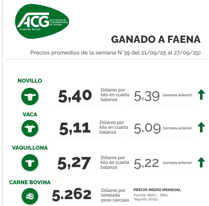 En tanto, la vaca gorda y la vaquillona marcaron un promedio en la planilla de Consignatarios de US$ 5,11 por kg a la carne (+2 cents) y de US$ 5,27 (+5 cents), respectivamente. “Con moderado aumento de valores y faena estable; mercado firme”, indicó la ACG en su comentario.
