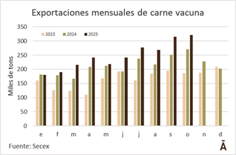 En octubre, tal como lo había hecho en julio y setiembre de este mismo año, Brasil volcó al mercado internacional un volumen récord de carne vacuna. De acuerdo con datos informados por la Secretaría de Comercio Exterior (Secex), las exportaciones sumaron 320.559 toneladas, superando en casi 6 mil toneladas el volumen embarcado en setiembre.