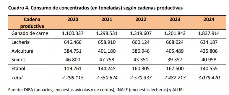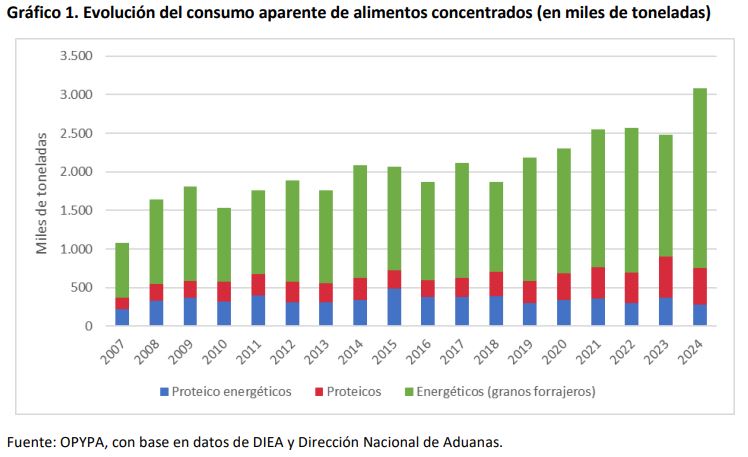 El uso de alimentos concentrados para la alimentación animal en Uruguay alcanzó en 2024 un máximo histórico, superando los 3,1 millones de toneladas, de acuerdo con un estudio de la Oficina de Programación y Política Agropecuaria (Opypa).