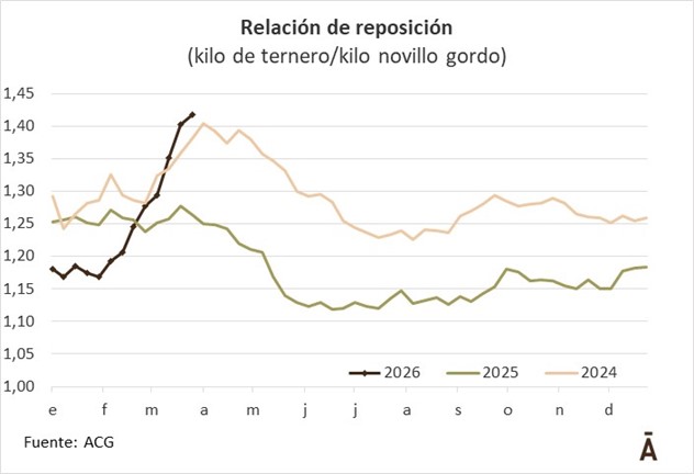 La relación flaco/gordo subió y quedó en 1,42 (versus 1,40), un nuevo máximo en lo que va del año. Es decir, hoy el kg del ternero cuesta un 42% más que el novillo con destino a faena.