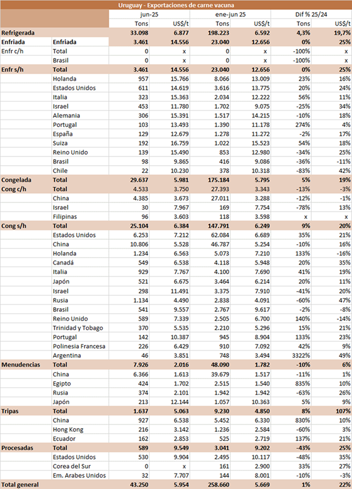 En el primer semestre de 2025 Uruguay embarcó al exterior 198 mil toneladas de carne vacuna a un valor medio de US$/t 6.592, de acuerdo con datos de solicitudes de exportación informados por Aduanas.