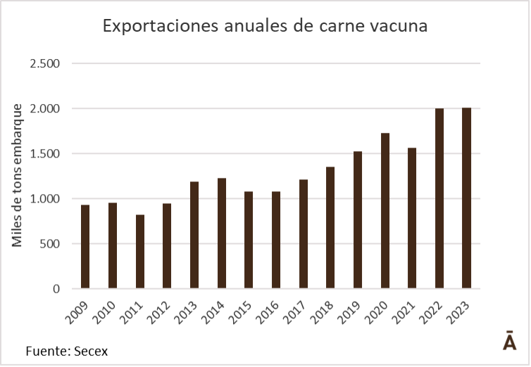Las exportaciones brasileñas de carne vacuna culminaron 2023 a todo ritmo. La Secretaría de Comercio Exterior (Secex) informó que en diciembre se embarcaron 208.440 toneladas, volumen mensual que nunca había sido alcanzado; el anterior récord había sido de 203.230 toneladas en agosto de 2022. El valor medio de exportación del mes fue de US$/t 4.548.
