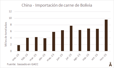 Bolivia crece a paso sostenido como origen de la carne vacuna importada por China. En noviembre llegaron desde el país del altiplano 9.600 toneladas de carne congelada con hueso, casi igualando lo que llegó desde Nueva Zelanda (9.747 tons) y muy poco por debajo de las 11.133 tons de carne estadounidense.