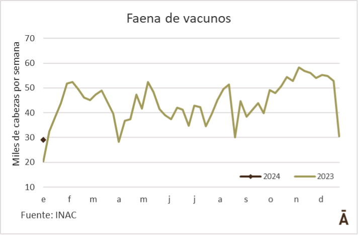 La faena de vacunos bajó nuevamente la semana pasada, aunque supera nítidamente a la de la primera semana de 2023. INAC informó que en la semana al 6 de enero se procesaron 29.137 vacunos, 5% menos que en la anterior (1.431 cabezas), aunque claramente por encima de la primera de 2023, cuando apenas se habían superado los 20 mil animales.
