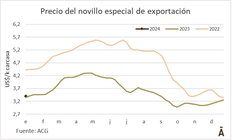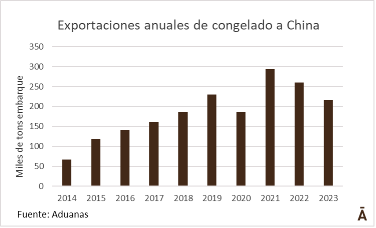 Las exportaciones de carne vacuna congelada de Uruguay a China en 2023 se contrajeron en 45 mil toneladas a 216 mil toneladas, una baja de 17%; además, el valor medio de exportación cayó 21% a US$/t 4.538. Por lo tanto, la facturación por las colocaciones en el principal cliente del exterior de Uruguay se desplomó 34% en el año, unos US$ 511 millones.