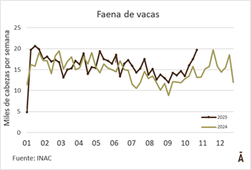 Con varias plantas que están trabajando a pleno dentro de la venta de producción para la cuota 481, de carne de animales terminados en corrales de engorde, la faena de vacunos pegó un salto semanal de casi 5.500 cabezas y fue la mayor en 13 semanas, desde la última de julio. INAC informó que se procesaron 49.626 vacunos en la semana al 25 de octubre. En la comparación anual, la faena creció en más de 6.500 cabezas.