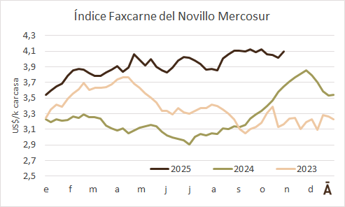 El valor medio del ganado a faena aumentó, impulsado por la mejora de las referencias en Brasil y Argentina. El Índice WBR del Novillo Mercosur subió 8 cents en la semana a US$ 4,10 el kilo carcasa.