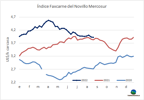 Brasil mantiene un intenso ritmo de exportaciones de carne vacuna que, de mantenerse, podría llevar a un récord mensual en agosto. De acuerdo con datos divulgados por la Secretaría de Comercio Exterior (Secex), Brasil exportó 128.549 toneladas de carne vacuna en los primeros 22 días del mes a un valor medio FOB de US$/t 6.255. El ritmo diario de ventas es 3,8% superior al de agosto de 2021 y el valor medio aumentó 10,1% anual.