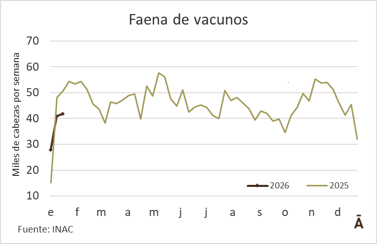 La faena de vacunos tuvo un modesto aumento la semana pasada. INAC informó que en la semana al 17 de enero se procesaron 41.816 animales, 972 más que en la anterior, aunque casi 9 mil por debajo de la misma semana del año pasado.
