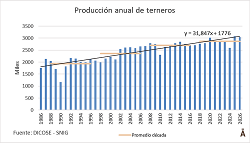 Es ambicioso, pero a las vistas de la evolución de la ganadería en el país, alcanzable. La línea de tendencia de crecimiento de la producción de terneros en los últimos 40 años indica que en 13-14 años se estaría llegando a los 3,5 millones. Quizás se pueda acelerar algo más y en unos 10 años haya que plantearse alcanzar los 4 millones. Será cuestión de seguir cumpliendo las metas.