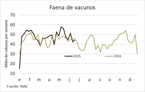 La faena de vacunos subió de forma moderada la semana pasada, manteniéndose en el eje de las 45 mil cabezas de la anterior. INAC informó que en la semana al 28 de junio ingresaron a planta 45.274 vacunos, un aumento semanal de 800 cabezas (2%) y de 4 mil comparado con la misma semana del año pasado.
