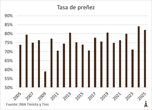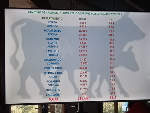 Los resultados del Taller de evaluación de los diagnósticos de gestación vacuna 2025, organizado por INIA Treinta y Tres, confirmaron ayer un excelente desempeño del entore 2024/25, con una tasa de preñez nacional del 82,1% sobre un total de 316.681 vientres analizados.