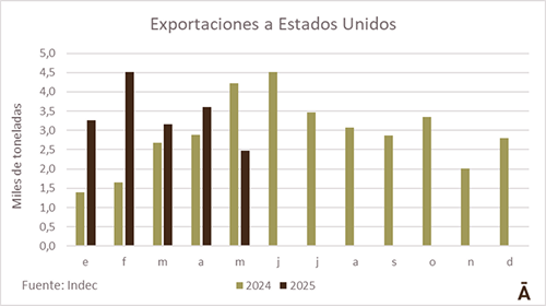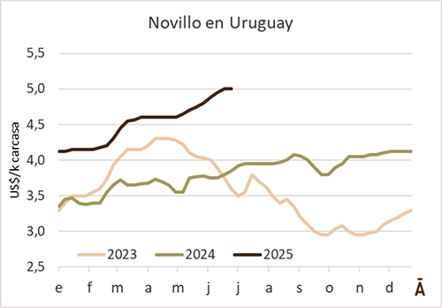 Las exportaciones de carne bovina de mayo de 2025 alcanzaron 53.780 toneladas (peso producto), 1,4% más que en el mes previo, aunque 3,8% inferior a mayo de 2024. En valor, los envíos de mayo de 2025 rondaron los US$ 293,6 millones, lo que marca subas de 9,4% intermensual y de 30,0% interanual. Se trató de la segunda mayor cifra desde los altísimos precios de 2022, tras el inicio del conflicto entre Rusia y Ucrania (solo superada en setiembre de 2024).