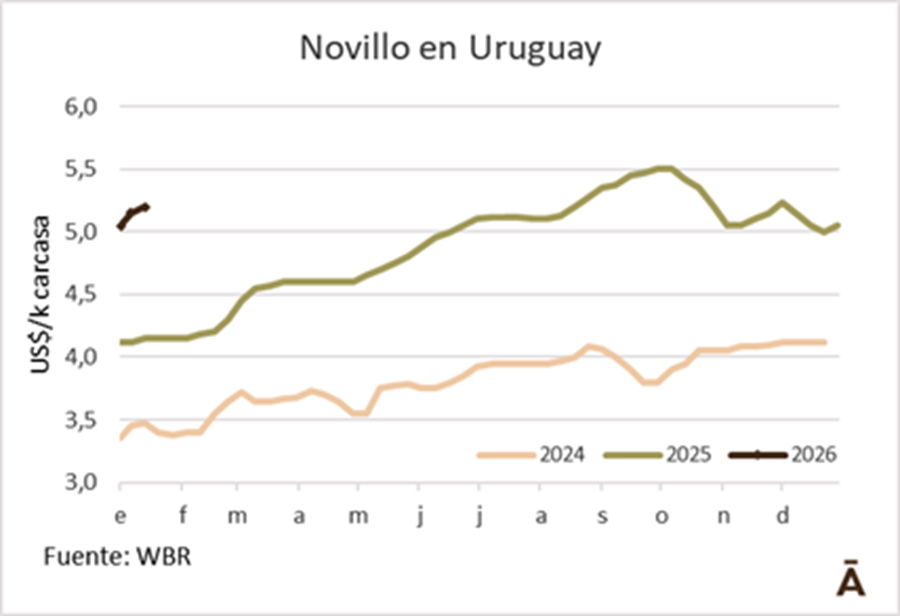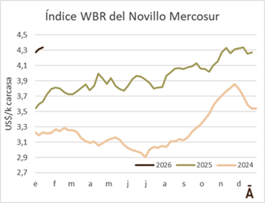 El valor medio del ganado a faena en la región subió otro escalón esta semana. El Índice WBR del Novillo Mercosur aumentó 2 cents a US$ 4,33 el kilo carcasa, el valor más alto desde principios de mayo de 2022, más de 40 meses atrás.