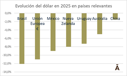 En la carrera del dólar Uruguay no juega solo y tiene (escaso) margen de maniobra para torcer una trayectoria de debilidad que parece irreversible a corto plazo. En algunos países relevantes y competidores la moneda estadounidense también ha perdido pie. Por ejemplo, en Brasil el dólar acumula una baja de 12% en lo que va del año, en Australia (-5%), Nueva Zelanda (-8%), o incluso en la Unión Europea la moneda estadounidense se ha depreciado 11% versus el €. En cambio, en destinos relevantes como China, el yuan apenas se ha depreciado 1,4% versus el dólar este año. El dólar cayó esta semana a su nivel más bajo desde abril frente a una canasta de divisas, marcada por crecientes expectativas de recortes de tasas por parte de la Reserva Federal (Fed) y la incertidumbre persistente sobre las negociaciones comerciales encabezadas por el presidente Donald Trump.