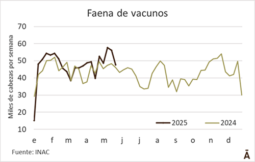 El ritmo de faena registró un freno marcado y quedó por debajo de las 50 mil cabezas. En la semana al 26 de mayo se procesaron 47.471 cabezas, una contracción del 15,4% (-8.648) versus siete días atrás, según informó el INAC. La faena de novillos totalizó 23.132 cabezas (-23,2%), la de vacas 17.123 (-2,4%), y la de vaquillonas 6.250 (-18,4%).
