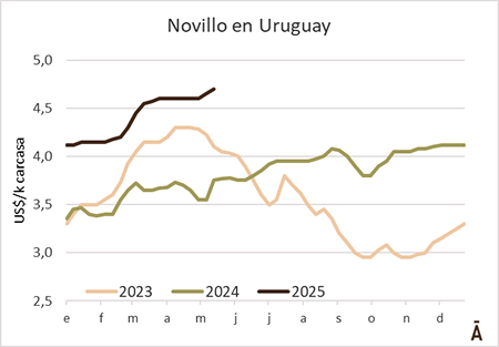 Con un “mercado firme” y con “entradas cortas”, los precios de la hacienda volvieron a tonificarse durante la última semana cerrada al 25 de mayo. Tras su reunión de precios de este lunes, la ACG fijó una referencia promedio de US$ 4,70 por kg carcasa para el novillo gordo (+5 cents), de US$ 4,43 por kg para la vaca gorda (7 cents) y de US$ 4,56 (+5 cents) para la vaquillona.