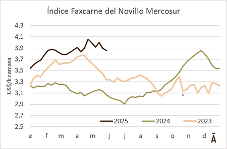 El índice Faxcarne del Novillo Mercosur perdió 5 centavos la última semana y cerró en US$ 3,85 por kg carcasa, su menor cotización desde el pasado 8 de abril (US$ 3,84).