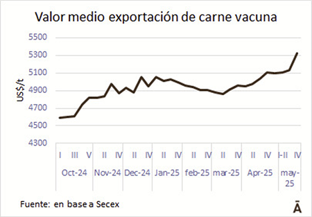 El valor medio de exportación de carne vacuna de Brasil sigue en alza. En la semana cerrada el 24 de mayo las 50.799 toneladas embarcadas promediaron US$/t 5.327, de acuerdo con información de la Secretaría de Comercio Exterior (Secex). Es el valor medio más alto desde noviembre de 2022, dos años y medio atrás.