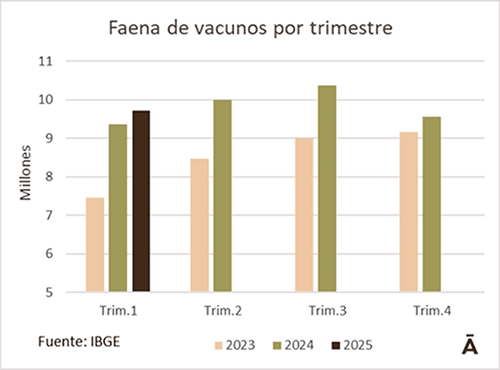 En el primer trimestre de 2025 se faenaron 9,71 millones de bovinos bajo algún tipo de servicio de inspección sanitaria, informó el Instituto Brasileño de Geografía y Estadística (Ibge). En comparación con el mismo período del año anterior, representa una variación positiva de 3,8% y respecto al cuarto trimestre de 2024 el incremento fue de 1,5%.