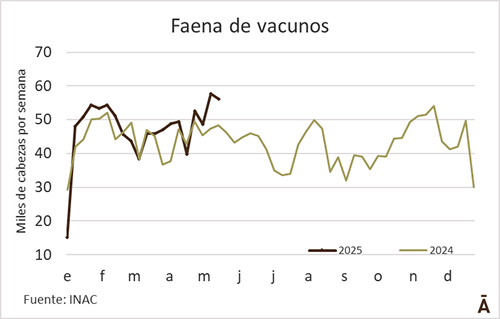 La faena de vacunos totalizó 56.155 animales en la semana cerrada al 17 de mayo, según los datos que divulgó el INAC. Ese volumen fue 2,7% inferior al volumen procesado una semana atrás (57.717 cabezas). La actividad industrial estuvo traccionada por la faena de novillos, que sumó 30.182 (+3,9%), lo que determinó una participación sobre el total del 54%. En el caso de las vacas (17.555) y vaquillonas (7.660), se produjo una baja semanal del 9,5% y 7,2%, respectivamente. En el primer caso se procesaron unas 2 mil cabezas menos.