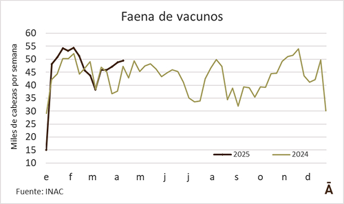 La faena de vacunos volvió a crecer la semana pasada. INAC informó que en la semana al 12 de abril ingresaron a planta 49.416 vacunos, 582 más que en la anterior y la mayor desde la segunda semana de febrero. Por cuarta semana consecutiva la faena supera a la del mismo período del año pasado.