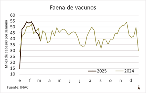 La faena de vacunos se sigue contrayendo. En la semana al 8 de marzo ingresaron a planta 38.312 vacunos, 5.377 menos (-12%) que en la anterior y 16 mil por debajo del pico de cuatro semanas atrás.