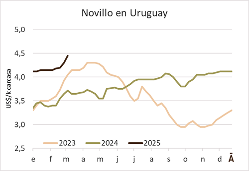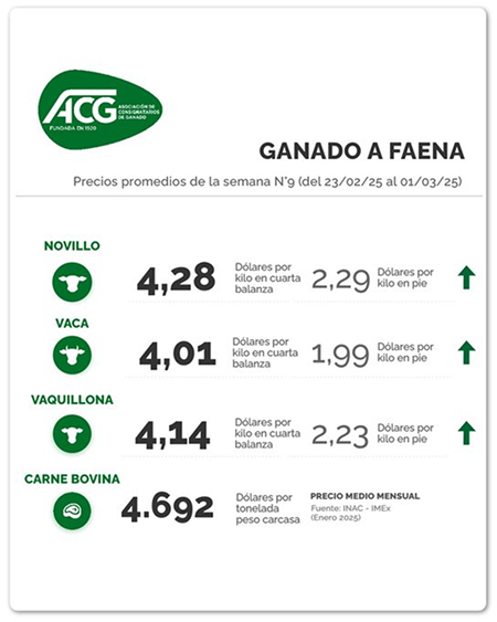 Con un “mercado firme y demandado”, los consignatarios volvieron a elevar en forma importante las referencias para los negocios de la hacienda en la semana cerrada al 1º de marzo. Según la ACG, el novillo gordo se negoció en promedio a US$ 4,28 por kg carcasa (+8 cents), la vaca a US$ 4,01 (+11 cents), y la vaquillona a US$ 4,14 (+10 cents). En tanto, el novillo especial de exportación quedó con una referencia de US$ 4,38 (+12 cents). En las últimas dos semanas, el precio del novillo gordo se valorizó 15 cents (+4%).