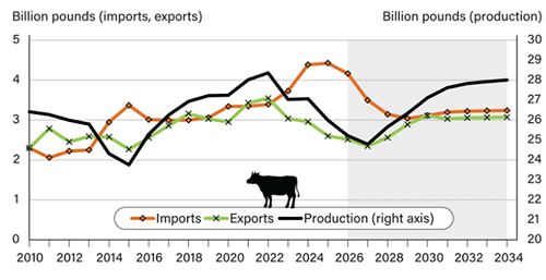 Se espera que las importaciones de carne vacuna de Estados Unidos alcancen su punto máximo este año en alrededor de 2 millones de toneladas, antes de caer a aproximadamente 1,36 millones de toneladas en 2029 como resultado de la reconstrucción del rodeo vacuno y una mayor producción, según el Servicio de Investigación Económica del Departamento de Agricultura de los Estados Unidos (USDA) en un pronóstico publicado a finales de la semana pasada. En el mismo informe, el USDA proyecta que las exportaciones de carne vacuna de EEUU disminuirán hasta 2027, alcanzando menos de 1 millón de toneladas, antes de recuperarse a más de 1,4 millones de toneladas en 2030.