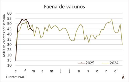 La faena de vacunos se contrajo por tercera semana consecutiva. INAC informó que al 1º de marzo ingresaron a planta 43.689 vacunos, casi 2 mil menos que en la anterior y acumulando un descenso de más de 10 mil cabezas en las tres últimas semanas. La faena fue 11% inferior a la de igual período de 2024.