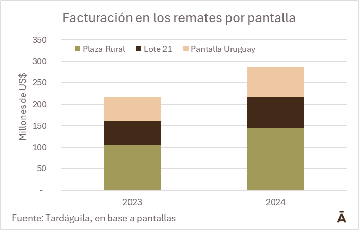 Las tres principales pantallas del país, Plazarural, Lote 21 y Pantalla Uruguay, comercializaron durante 2024 un total de 510.420 vacunos, con un consistente aumento de 12% respecto a los 457.243 del año anterior. Además, el precio medio de comercialización aumentó 18% a US$ 562 por cabeza. Por lo tanto, en las tres pantallas se movilizaron US$ 287 millones, un aumento anual de 32%.
