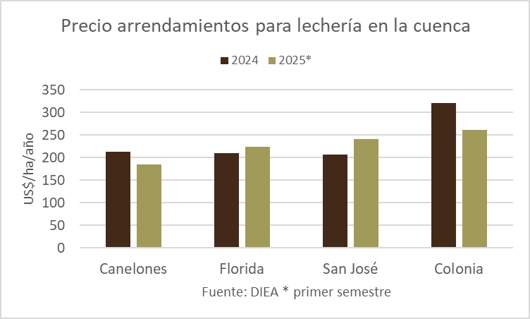 Según el relevamiento de la DIEA-MGAP, el precio medio de los arrendamientos para uso lechero alcanzó los US$/ha/año 230, lo que implica un aumento interanual del 5% frente a 2024.