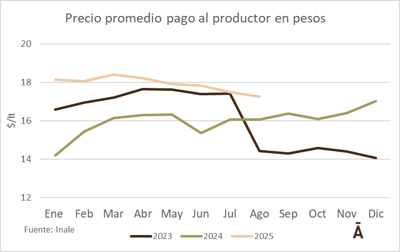 Respecto a agosto del año pasado, el precio por litro de leche en pesos corrientes tuvo un aumento del 7% y de 8% en dólares, mientras que el kg de sólidos mejoró 6% en igual comparación.