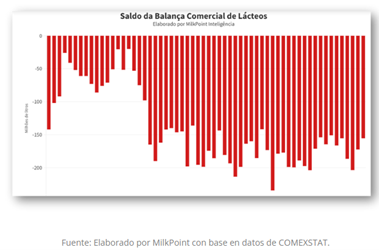 La balanza comercial de productos lácteos de Brasil volvió a mejorar en diciembre, impulsada por una continua disminución de las importaciones y un aumento de las exportaciones. La balanza comercial de productos lácteos cerró en -155,4 millones de litros de leche equivalente en diciembre, lo que representa una reducción del 10% mensual (-172,3 millones de litros en noviembre).