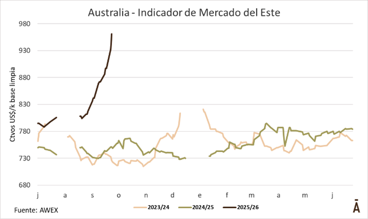 El Indicador del Mercado del Este (IME) culminó la semana del 26 de septiembre de 2025 con un repunte de precios sostenido e inusualmente fuerte. El IME cerró en A$ 14,53 por kilogramo base limpia, lo que se tradujo en US$ 9,61, considerando el tipo de cambio A$/US$ de 0,662. Este avance representó una ganancia semanal de A$ 1,09 y de 0,64 centavos estadounidenses.